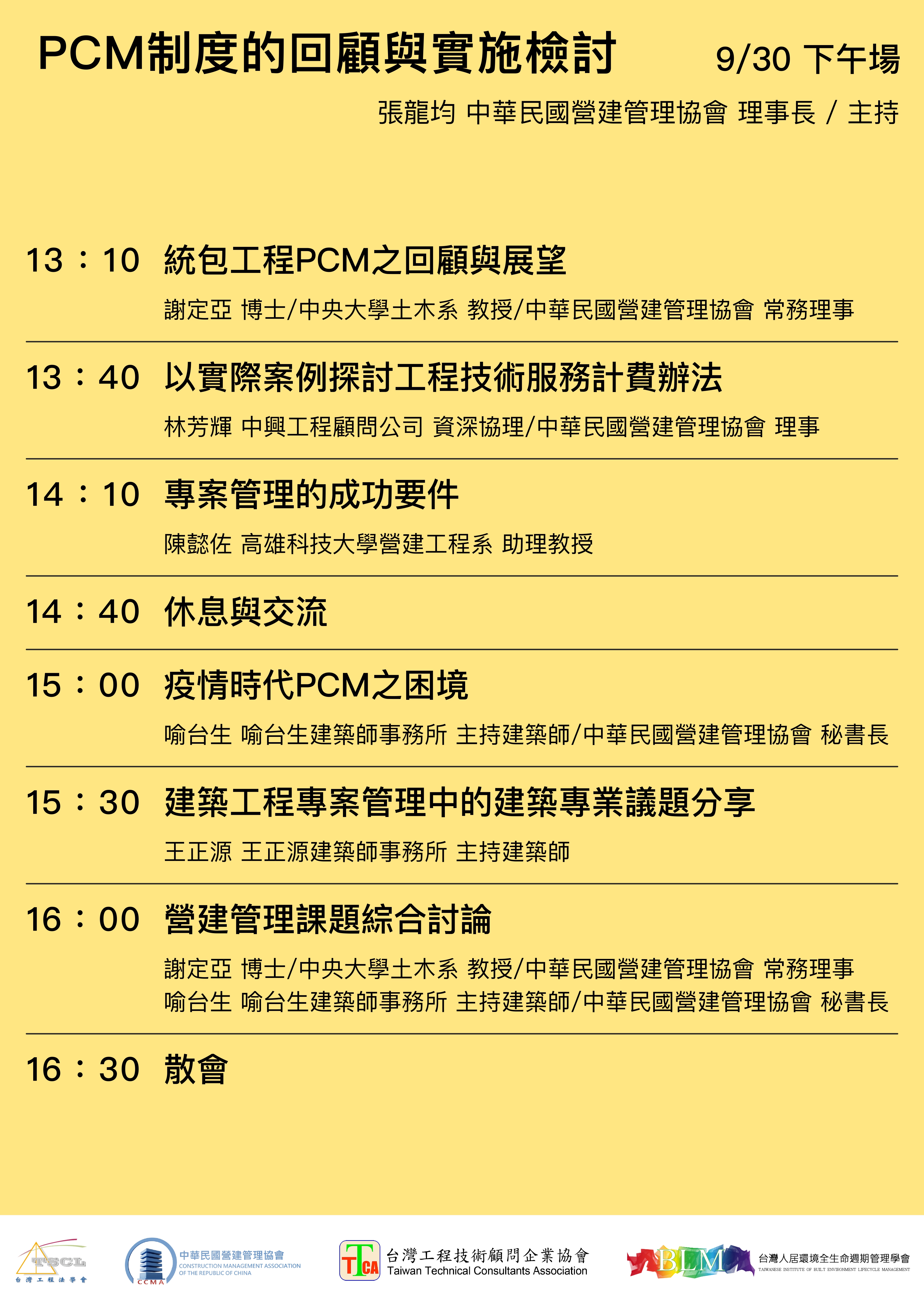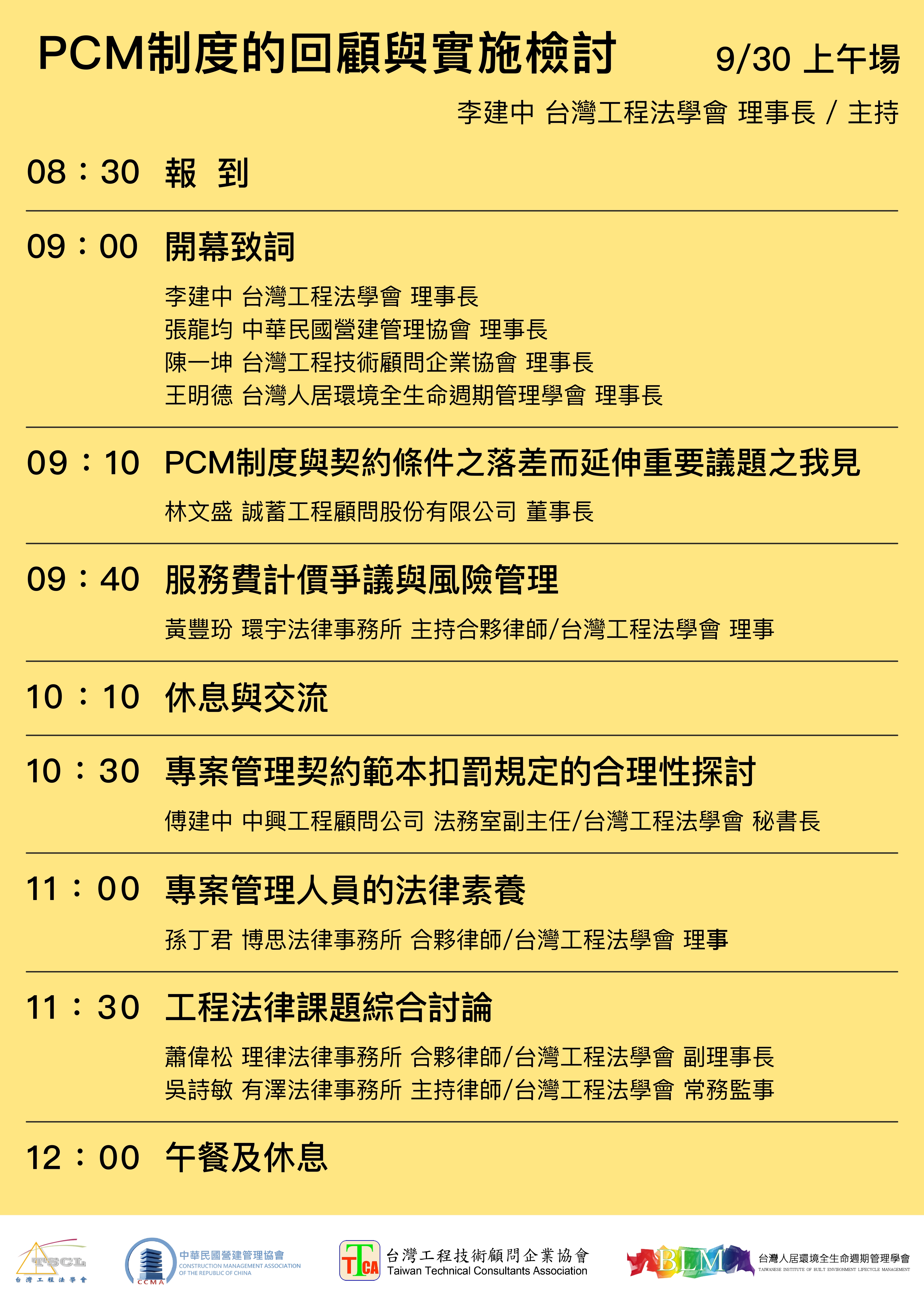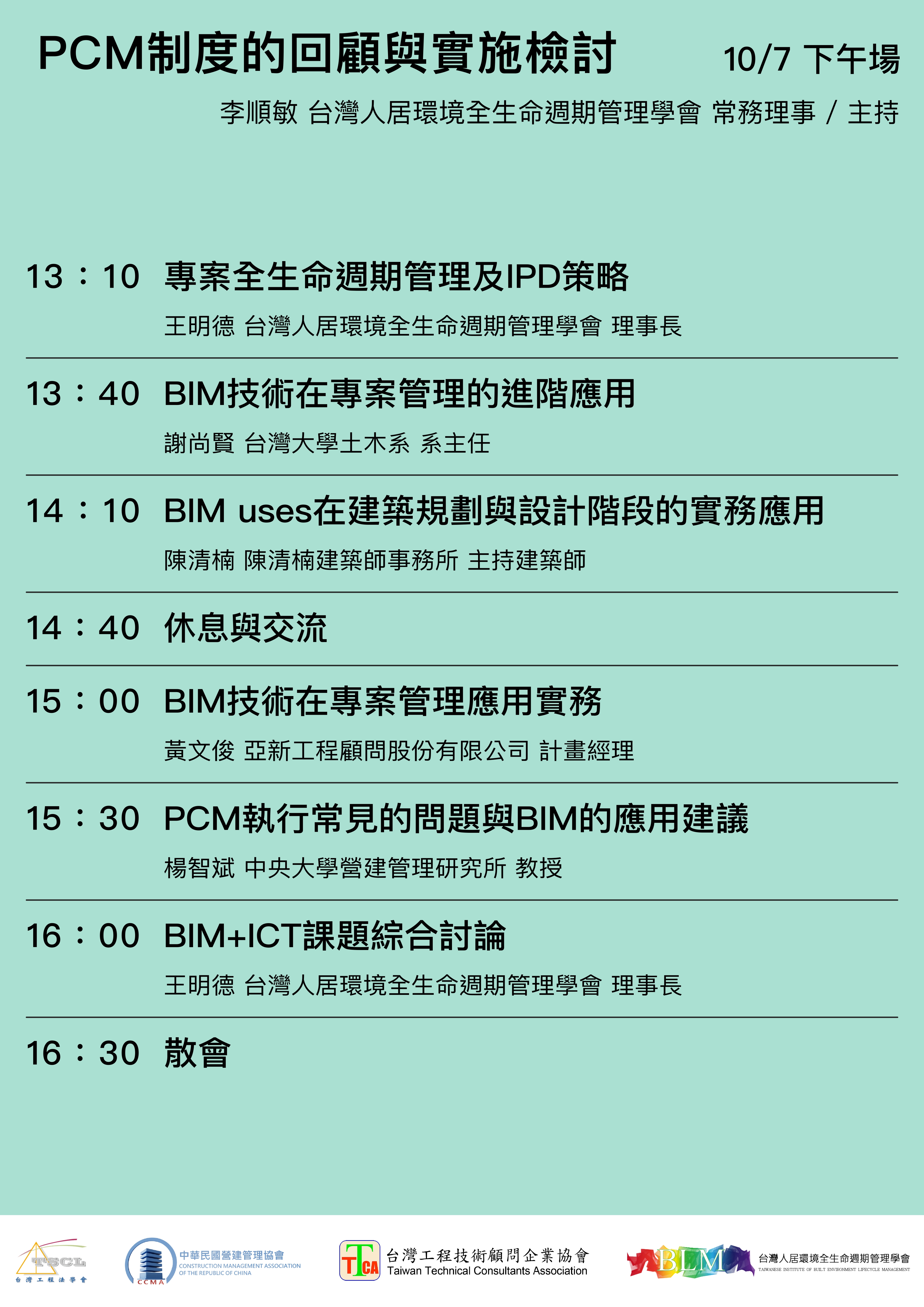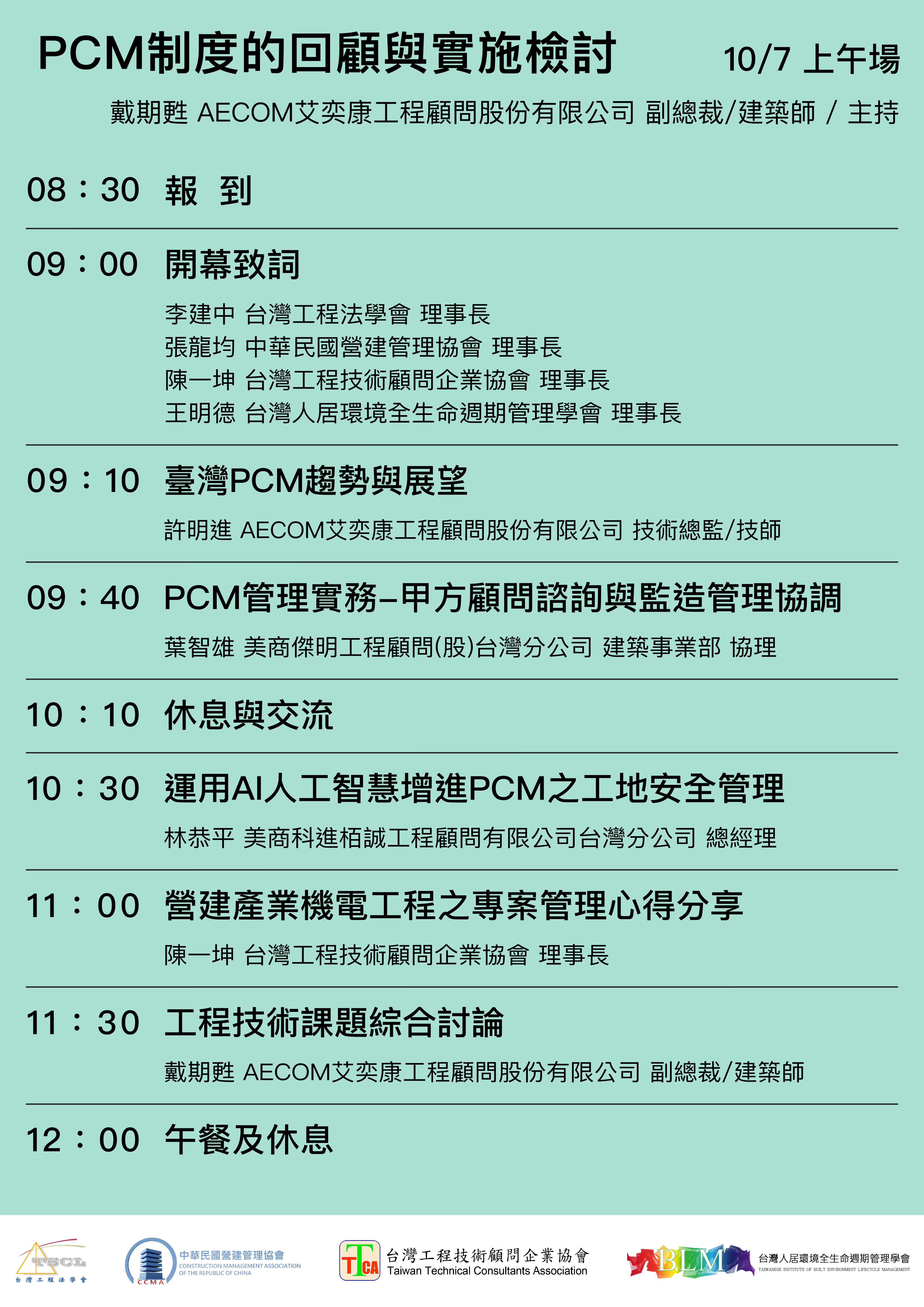 主辦單位:PCM聯盟 (中華民國營建管理學會、台灣工程法學會、台灣工程技術顧問企業協會、台灣人居環境全生命週期管理學會)